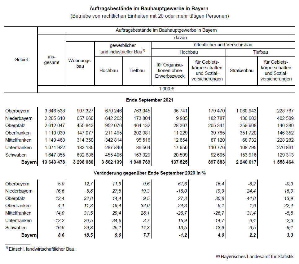 Das bayerische Bauhauptgewerbe verzeichnet Ende September 2021 Auftragsbestände im Gesamtwert von 13,6 Milliarden Euro. Nach Mitteilung des Bayerischen Landesamts für Statistik ist der Auftragsbestand um 1,1 Milliarden Euro beziehungsweise 8,6 Prozent höher als Ende September 2020. Einen überdurchschnittlichen Zuwachs erfahren bei den Bausparten der Wohnungsbau mit 18,5 Prozent sowie der gewerbliche und industrielle Hochbau mit 9,0 Prozent. Beide Bausparten tragen zusammen 6,9 Milliarden Euro und damit die Hälfte des aktuellen bauhauptgewerblichen Auftragsbestandes in Bayern. Auf Ebene der Regierungsbezirke ist regional ein überdurchschnittliches Plus für Niederbayern, die Oberpfalz, Mittelfranken und Schwaben zu berichten. Oberbayern punktet mit 5,0 Prozent unterdurchschnittlich positiv, verbucht aber mit 3,8 Milliarden Euro beziehungsweise 28,2 Prozent vom Bestandsvolumen den größten Anteil.