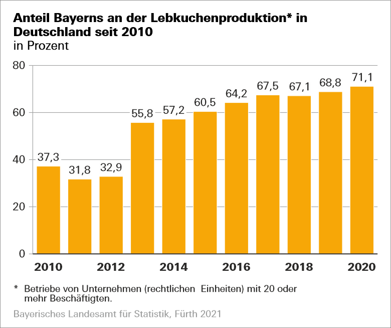 Nach Angaben des Bayerischen Landesamts für Statistik produzieren bayerische Betriebe von Unternehmen mit 20 oder mehr Beschäftigten im Jahr 2020 insgesamt 61 535 Tonnen Lebkuchen. Dies ist der höchste Wert der letzten zehn Jahre. Damit stammen rund 71 Prozent aller in Deutschland produzierten Lebkuchen aus Bayern, was ebenfalls einen neuen Höchstwert bedeutet.