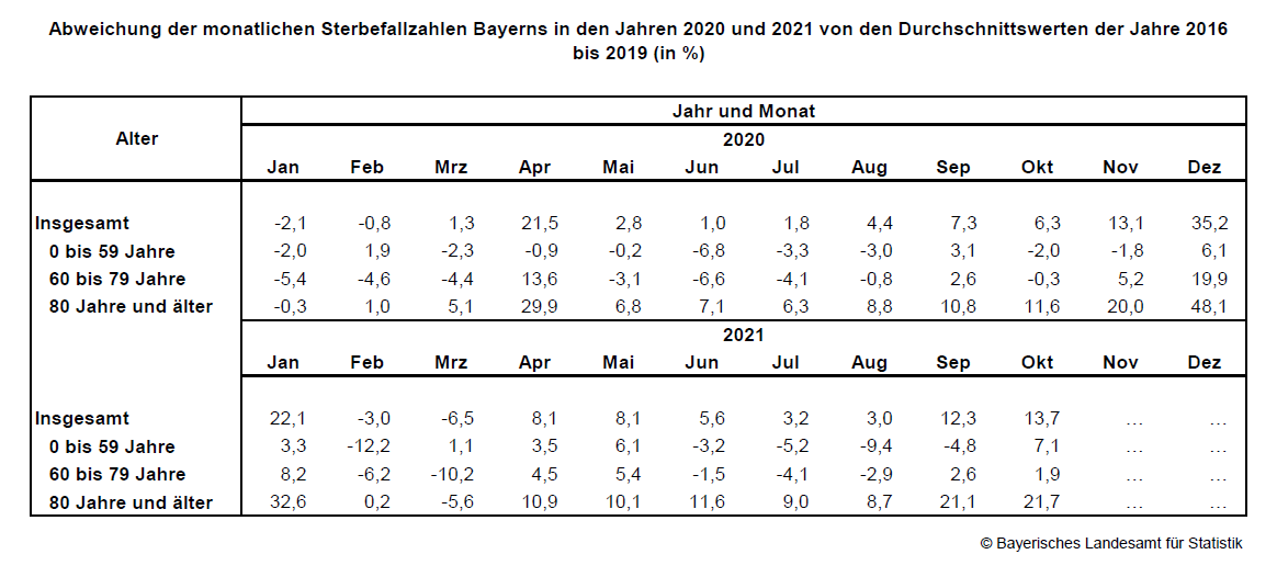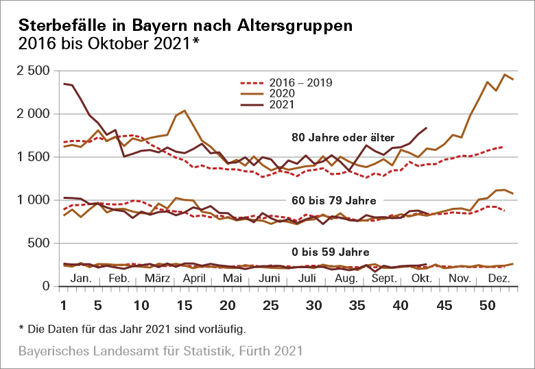 Die Auswertung aktueller vorläufiger Daten zeigt, dass sich die Zahl Verstorbener im Freistaat im Oktober 2021 insgesamt auf leicht erhöhtem Niveau im Vergleich zu den Jahren 2016 bis 2019 bewegt. Für die Gruppe der 80-Jährigen und Älteren registriert das Bayerische Landesamt für Statistik im September 2021 einen Anstieg der Sterbefälle von 21,7 Prozent.