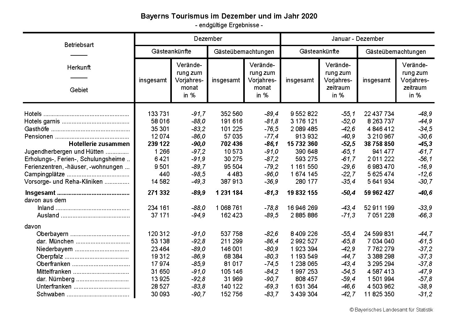 Die dem Bayerischen Landesamt für Statistik nun vorliegenden, endgültigen Ergebnisse zur Monatserhebung im Tourismus für Dezember und das Jahr 2020 spiegeln die Auswirkungen der Corona-Pandemie auf das Tourismusjahr und die im Dezember 2020 geöffneten 7 245 Beherbergungsbetriebe in Bayern*) deutlich wider. Sprach man im Vorjahr noch von neuen Rekordwerten für Bayerns Tourismus, sind die Einschränkungen durch die Corona-Pandemie, trotz zeitweiser Lockerungen insbesondere in den Monaten Mai bis Oktober, nun umso drastischer sichtbar. So gingen die Ankunftszahlen um 50,4 Prozent auf rund 19,8 Millionen und die Übernachtungszahlen um 40,6 Prozent auf rund 60,0 Millionen zurück. Dabei entfielen 85,4 Prozent der Gästeankünfte (2019: 74,8 Prozent) und 88,2 Prozent der Übernachtungen (2019: 79,3 Prozent) auf Gäste aus dem eigenen Land.
