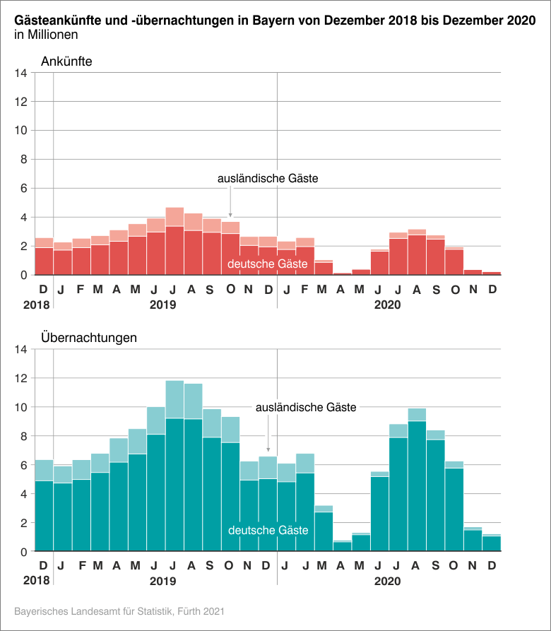 Die Bilanz zum Jahresende 2020 ist für die Beherbergungsbetriebe*) Bayerns ernüchternd: Wie das Bayerische Landesamt für Statistik mitteilt, sanken die Gästeankünfte aufgrund der Corona-Einschränkungen im Jahr 2020 um 50 Prozent auf knapp 20 Millionen. Zuletzt wurde diese Marke im Jahr 1989 unterschritten. Die Zahl der Übernachtungen brach gegenüber dem Jahr 2019 um 41 Prozent auf nunmehr 60 Millionen ein. Nur noch 15 Prozent aller Gäste kamen aus dem Ausland. Besonders groß fielen die Einbußen in den bayerischen Großstädten aus.