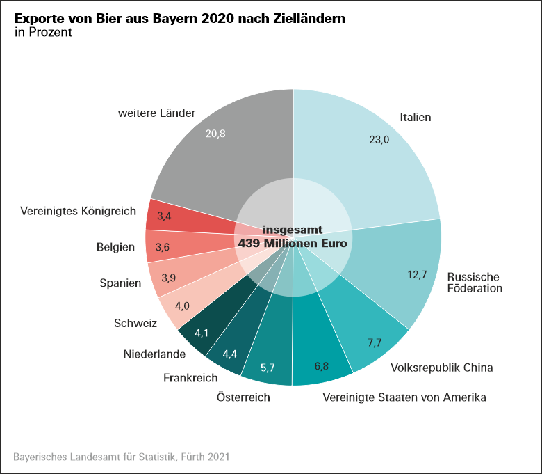 Das Reinheitsgebot von 1516 zeichnet bayerisches Bier aus. Umso weniger verwundert es, dass Bier zu den wichtigsten Exportgütern der Ernährungswirtschaft zählt. Im Jahr 2020 erzielte es einen Exportwert von 439 Millionen Euro. Die wichtigsten Abnehmerländer waren Italien, Russland, die Volksrepublik China, die Vereinigten Staaten und Österreich.