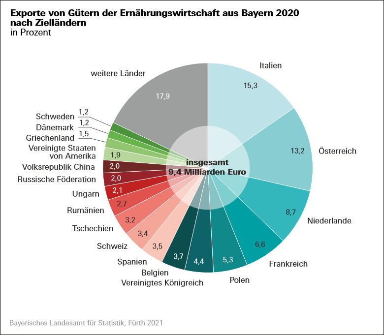 Güter der Ernährungswirtschaft aus Bayern wurden in alle Kontinente exportiert. Die wertmäßig bedeutendsten Zielländer stammen jedoch aus Europa. Es waren Italien, Österreich, die Niederlande, Frankreich, Polen und das Vereinigte Königreich. Ebenso bezieht die bayerische Wirtschaft Güter der Ernährungswirtschaft vorwiegend aus Europa, allen voran aus Österreich, Italien, den Niederlanden, Polen und Frankreich.