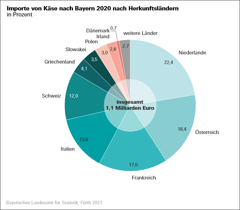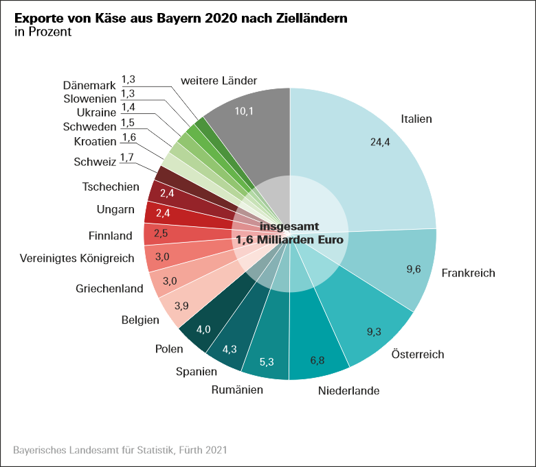 Wichtiges Export- und Importgut ist Käse. Die bayerische Wirtschaft exportierte 2020 Käse im Wert von 1,6 Milliarden Euro und importierte Käse im Wert von 1,1 Milliarden Euro. Käse aus Bayern wird am häufigsten von Italien, Frankreich, Österreich und den Niederlanden nachgefragt. Bayern bezieht Käse überwiegend aus den Niederlanden, Österreich, Frankreich, Italien und der Schweiz.