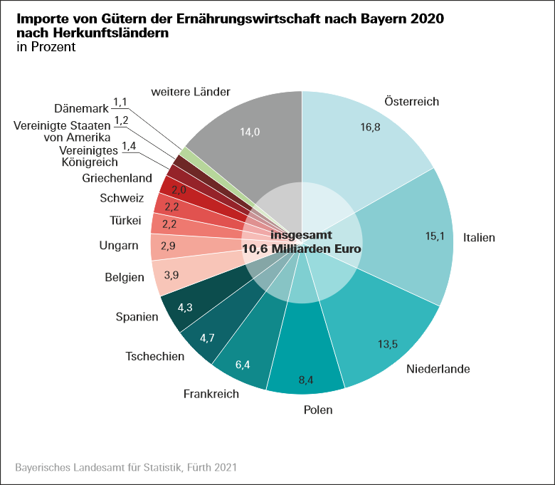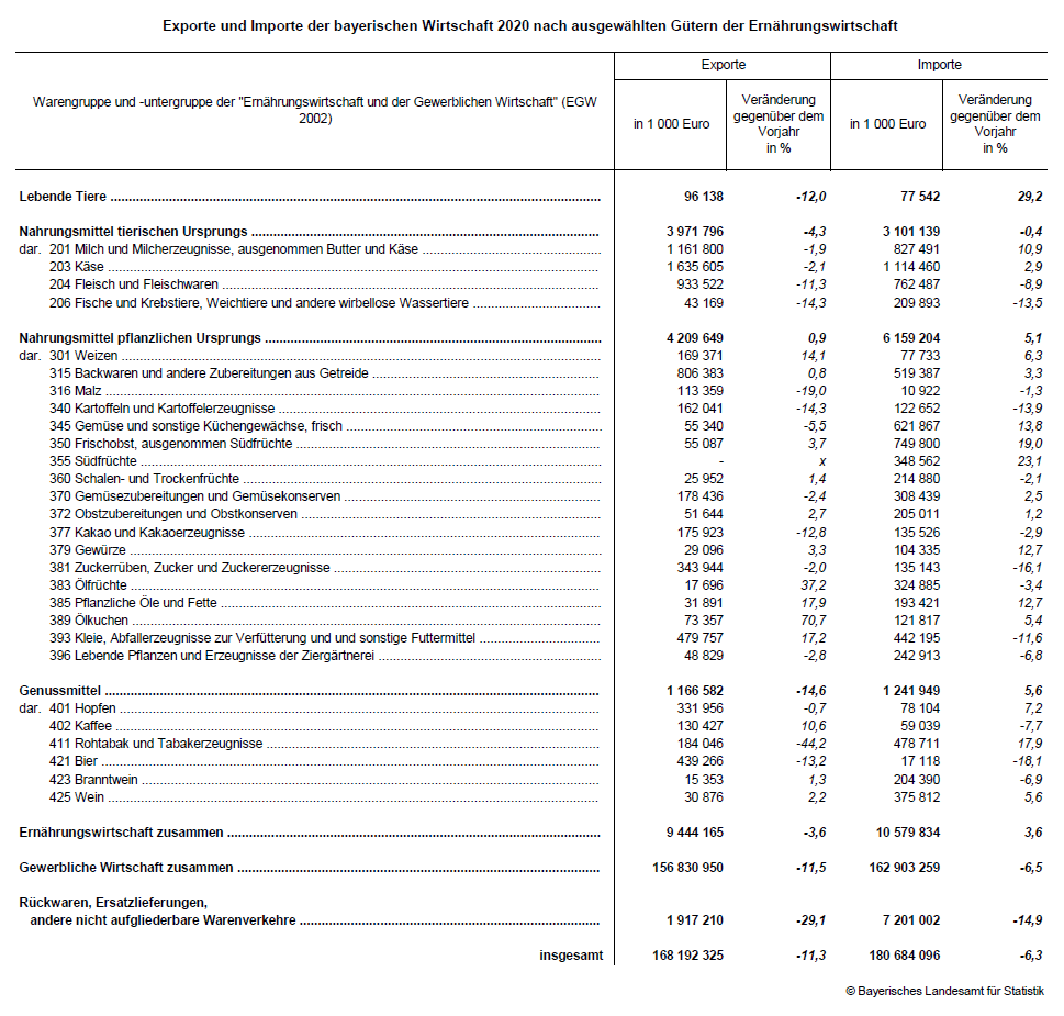 Die Güter der Ernährungswirtschaft hatten im Jahr 2020 Anteile von 5,6 Prozent und von 5,9 Prozent an den gesamten Exporten bzw. Importen der bayerischen Wirtschaft. Der Exportwert betrug 9,4 Milliarden Euro. Das entspricht einem Rückgang gegenüber 2019 von 3,6 Prozent. Die Importe stiegen entgegen dem allgemeinen Abwärtstrend um 3,6 Prozent auf 10,6 Milliarden Euro.