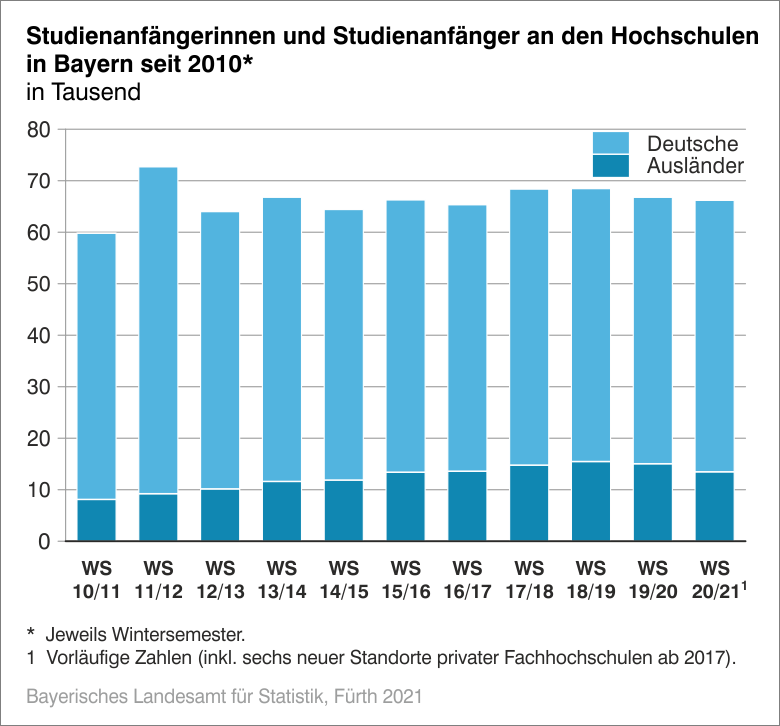 Im Studienjahr 2020 (Sommersemester 2020 und Wintersemester 2020/ 21) sinkt in Bayern die Zahl der Studienanfänger um 2,6 Prozent auf 73 902 Personen, davon -15,0 Prozent im Sommersemester auf 7 689 und -0,9 Prozent im Wintersemester auf 66 213 Ersteinschreibungen.