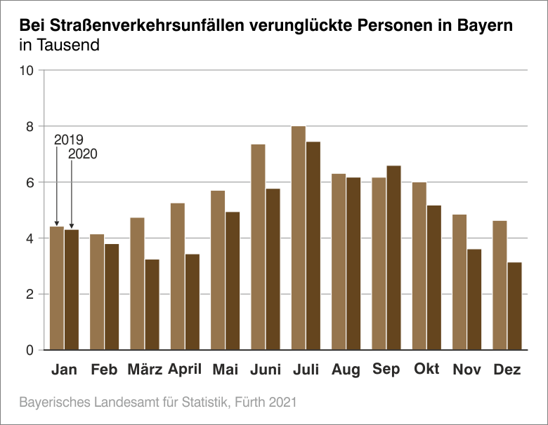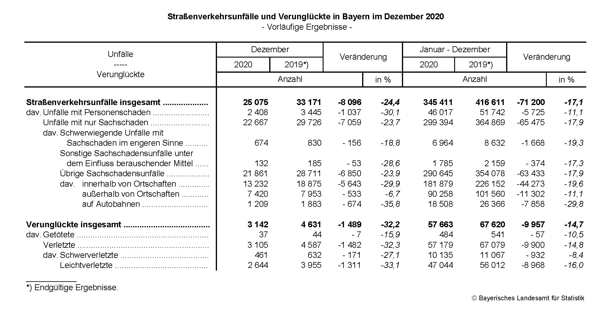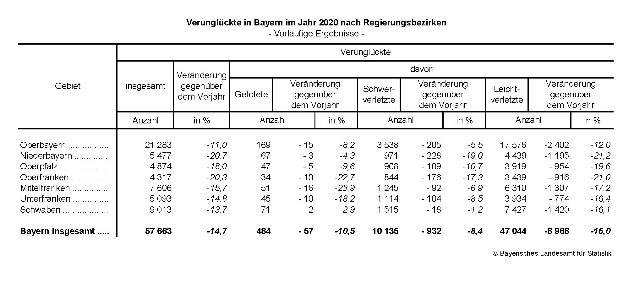 Im Jahr 2020 verunglückten nach vorläufigen Ergebnissen der Polizei 57 663 Menschen auf Bayerns Straßen. Wie das Bayerische Landesamt für Statistik weiter mitteilt, kamen 484 Menschen ums Leben (-10,5 Prozent), 57 179 (-14,8 Prozent) wurden verletzt, davon 10 135 schwer (-8,4 Prozent). Diese Entwicklung ist auch auf das durch die Corona-Pandemie bedingte geringere Verkehrsaufkommen zurückzuführen. Im Vergleich zum vergangenen Jahr verunglückten vor allem in den Lockdown-Monaten März und April sowie November und Dezember 2020 weniger Menschen im Straßenverkehr.