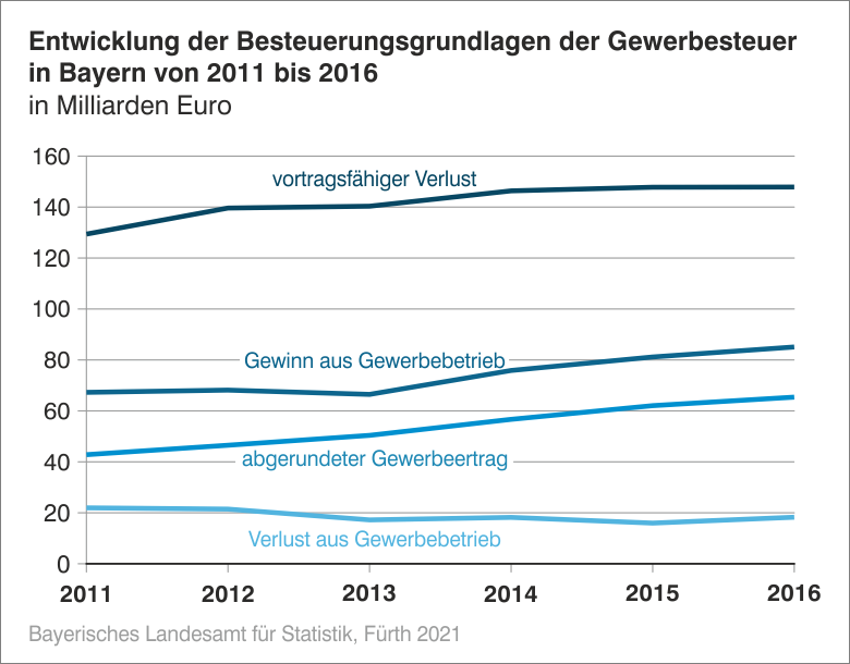 Hinsichtlich der Besteuerungsgrundlagen ist festzustellen, dass der Gewinn aus Gewerbebetrieb in 2016 bei 85,1 Milliarden Euro und somit um 4,8 Prozent über dem Vorjahreswert lag. Der vortragsfähige Verlust (147,9 Milliarden Euro) blieb in Relation zum Jahr 2015 nahezu gleich (+0,1 Prozent). Zieht man einen Vergleich innerhalb eines Fünf-Jahres-Zeitraumes, so erhöhte sich der Gewinn aus Gewerbebetrieb verglichen mit dem Jahr 2011 sogar um 26,5 Prozent. Auch beim vortragsfähigen Verlust ließ sich im gleichen Zeitraum ein Zuwachs von 14,3 Prozent feststellen. Während der Fünfjahresfrist hat sich außerdem die Anzahl der gewerbesteuerpflichtigen Betriebe um 20,4 Prozent erhöht.