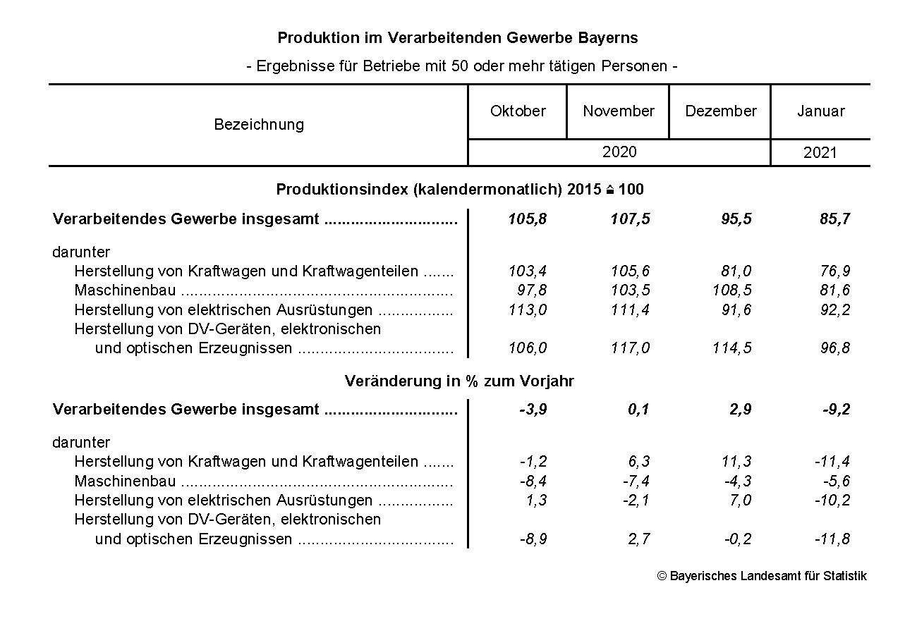 Die Produktion der bayerischen Industrie (Verarbeitendes Gewerbe sowie Bergbau und Gewinnung von Steinen und Erden, bezogen auf den Berichtskreis „Betriebe mit 50 oder mehr Beschäftigten“) verzeichnete im Januar 2021 ein deutliches Minus von 9,2 Prozent gegenüber dem Vorjahresergebnis.