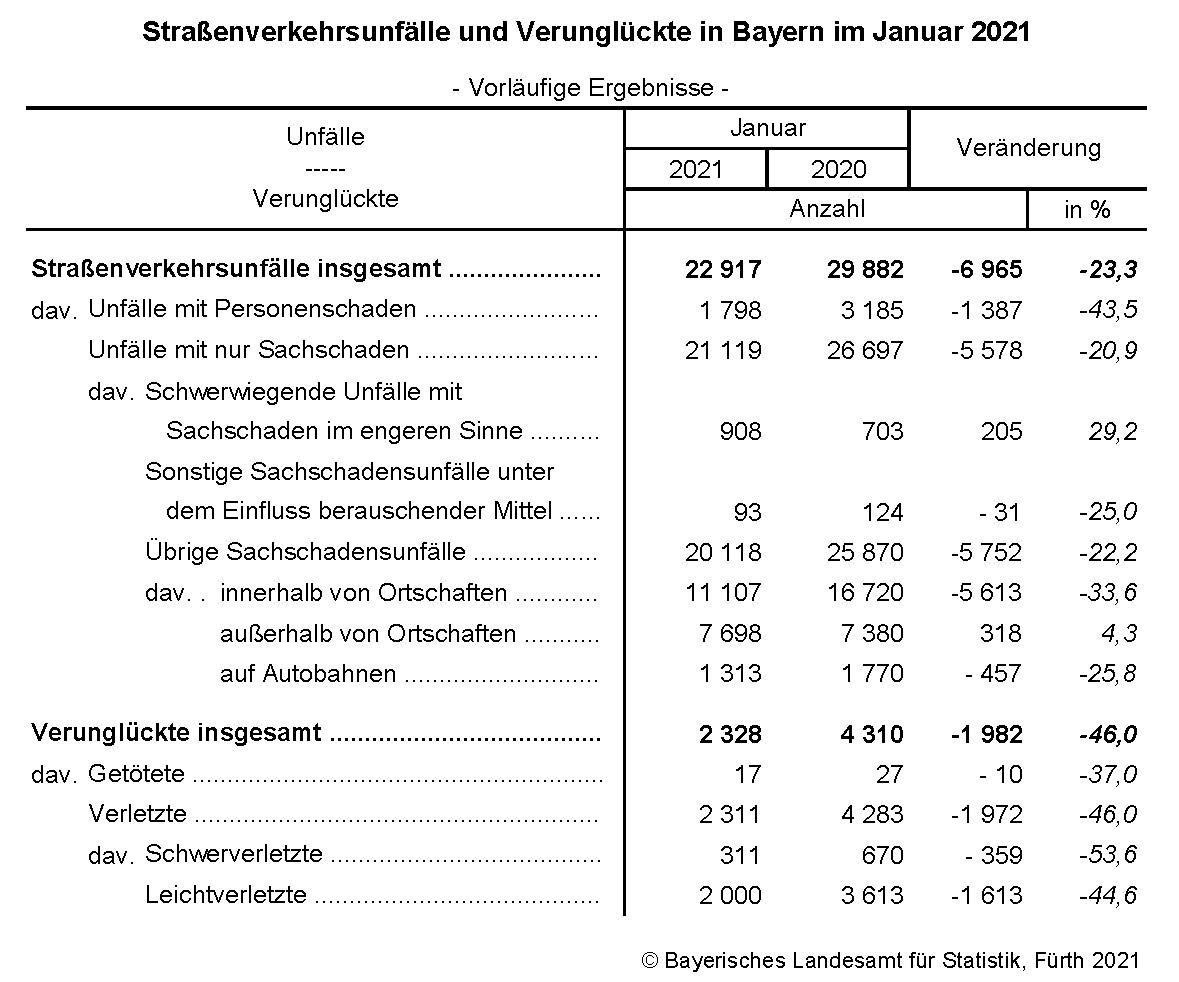 Im Januar 2021 ereigneten sich auf Bayerns Straßen nach vorläufigen Meldungen der Polizei insgesamt 22 917 Unfälle und somit 23,3 Prozent weniger als im Vorjahresmonat. Nach Mitteilung des Bayerischen Landesamts für Statistik sanken Unfälle mit Personenschaden um 43,5 Prozent, Sachschadensunfälle um 20,9 Prozent. Die Zahl der Verunglückten verringerte sich um 46,0 Prozent auf 2 328 Fälle insgesamt. Es wurden 17 Verkehrsteilnehmer getötet (-37 Prozent), 311 schwer (-53,6 Prozent) und 2 000 leicht verletzt (-44,6 Prozent).