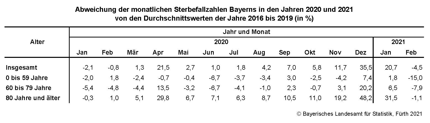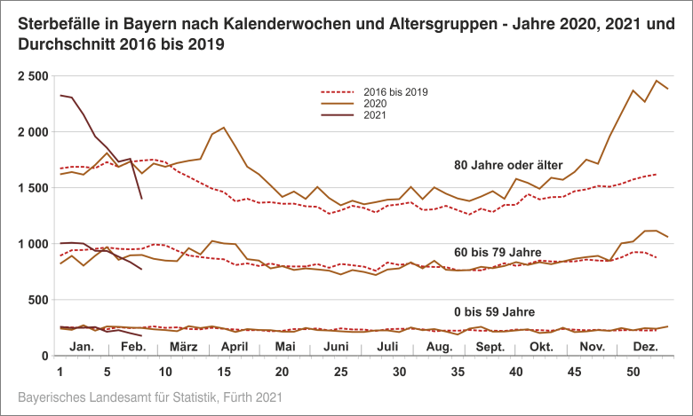 Bislang wurden für Januar 2021 15 326 Verstorbene registriert, für Februar 11 312. Im Vergleich bedeutet dies für Januar eine Zunahme um 2 902 Todesfälle gegenüber 2020 bzw. eine Erhöhung um gut ein Fünftel gegenüber dem Schnitt der Jahre 2016 bis 2019. Auf regionaler Ebene hatten im Januar 2021 zehn kreisfreie Städte bzw. Landkreise Sterbefallzahlen zu verzeichnen, die mehr als 50 Prozent über dem Durchschnitt der Jahre 2016 bis 2019 lagen, für fünf Kreise bzw. kreisfreie Städte wurde sogar eine Zunahme von über 75 Prozent registriert (Lk Bayreuth +83 %, Stadt Weiden +83 %, Lk Regen +82 %, Stadt Coburg +82 %, Lk Roth +76 %). Die für den Februar 2021 ermittelte Sterbefallzahl liegt dagegen um 4,5 Prozent unter dem Durchschnitt der Vorjahre.