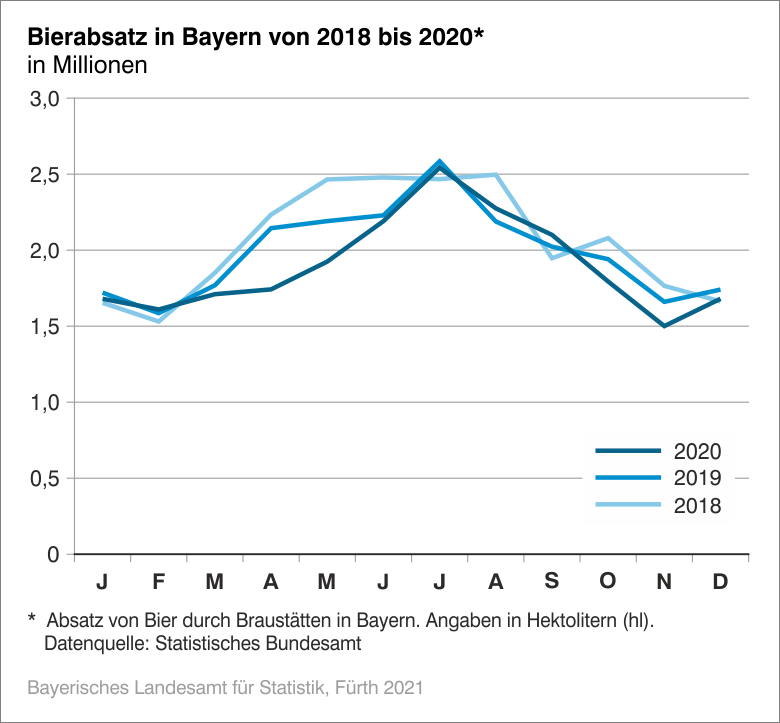 Wie auch im Vorjahr war im Jahr 2020 der höchste Bierabsatz in den Sommermonaten Juni, Juli und August zu verzeichnen. Rückgänge im Bierabsatz waren jeweils im Vergleich zum entsprechenden Vorjahresmonat in den Monaten März (-3,3 Prozent), April (-18,8 Prozent) und Mai (-12,2 Prozent) zu verzeichnen.