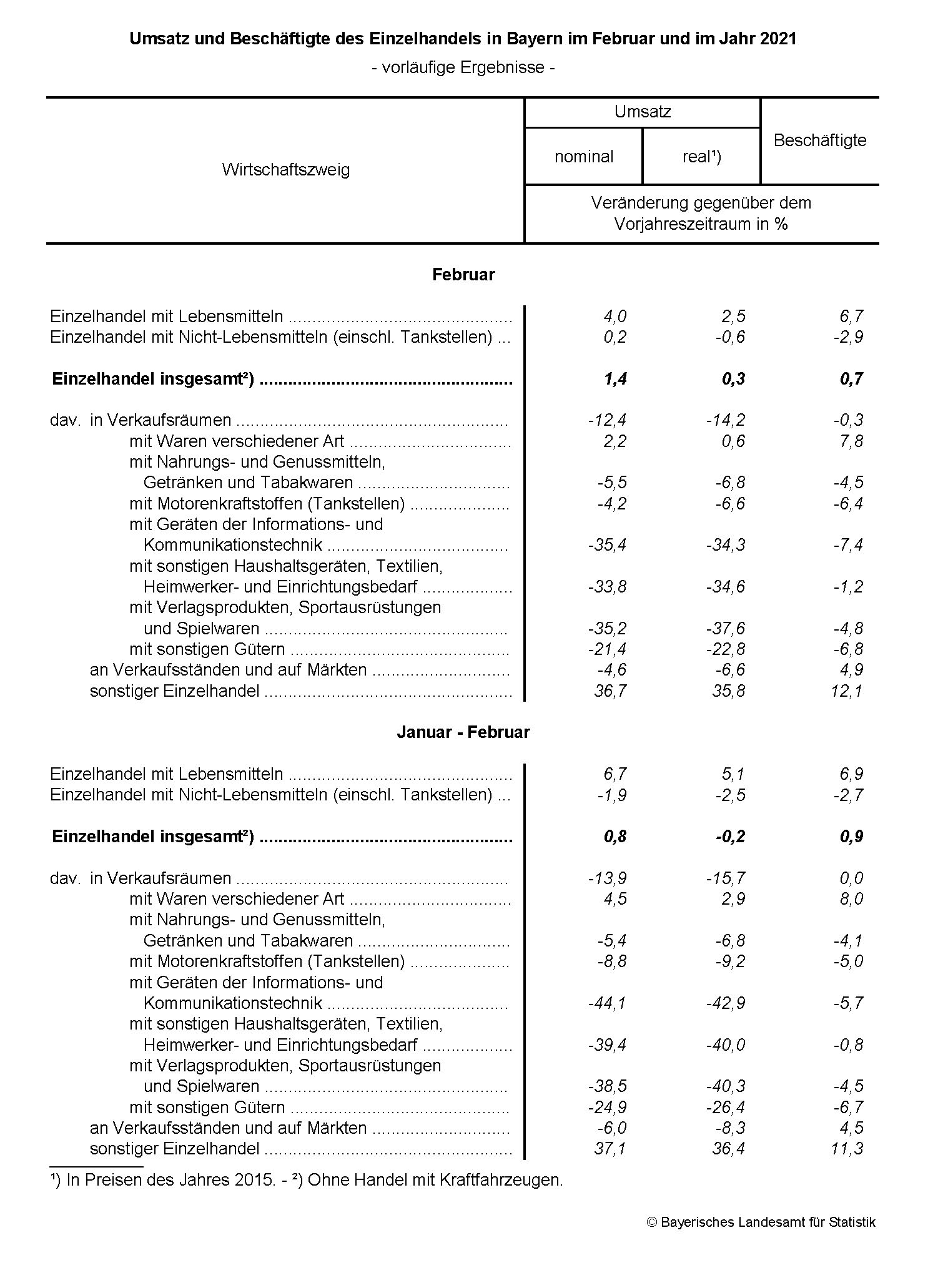 Wie das Bayerische Landesamt für Statistik nach den vorliegenden Ergebnissen der „Monatsstatistik im Einzelhandel“ berichtet, stieg der Umsatz im bayerischen Einzelhandel (ohne Kraftfahrzeughandel) im Februar 2021 im Vergleich zum Vorjahresmonat nominal um 1,4 Prozent und preisbereinigt um 0,3 Prozent. Die Zahl der Beschäftigten wuchs um 0,7 Prozent. – In den ersten beiden Monaten 2021 nahm der nominale Umsatz des Einzelhandels im Vergleich zum Vorjahreszeitraum um 0,8 Prozent zu (preisbereinigt: -0,2 Prozent), die Zahl der Beschäftigten erhöhte sich um 0,9 Prozent.