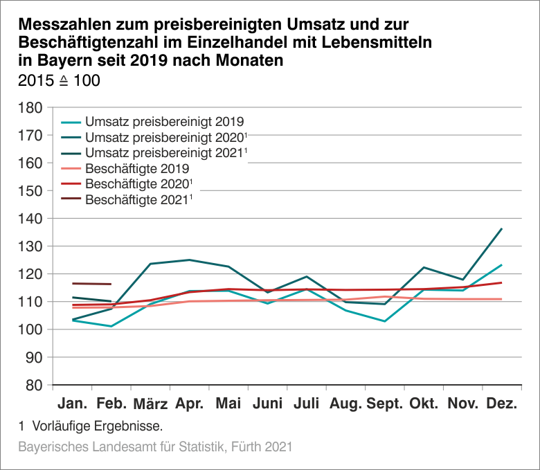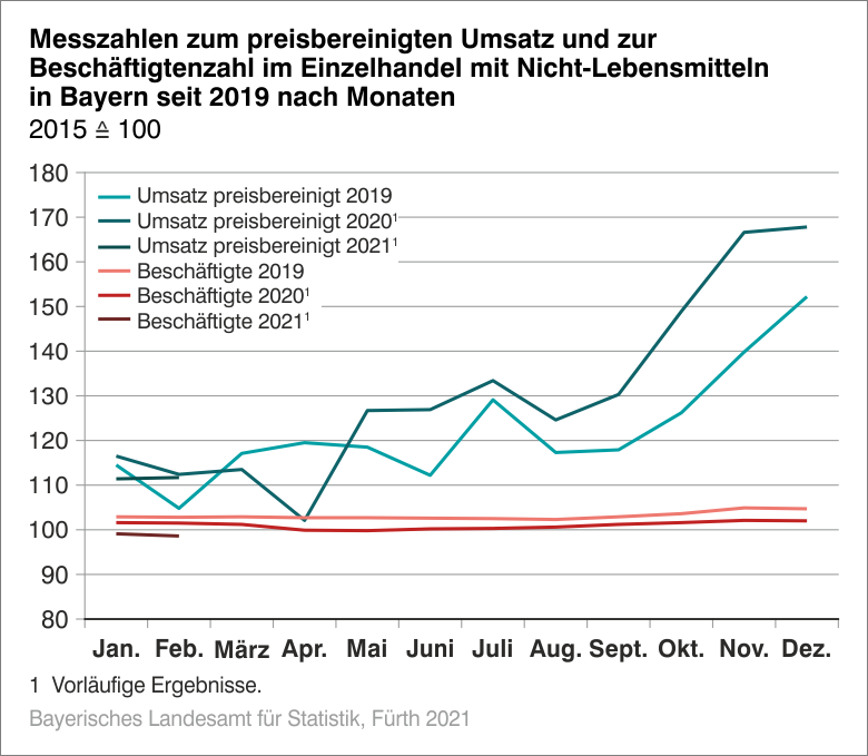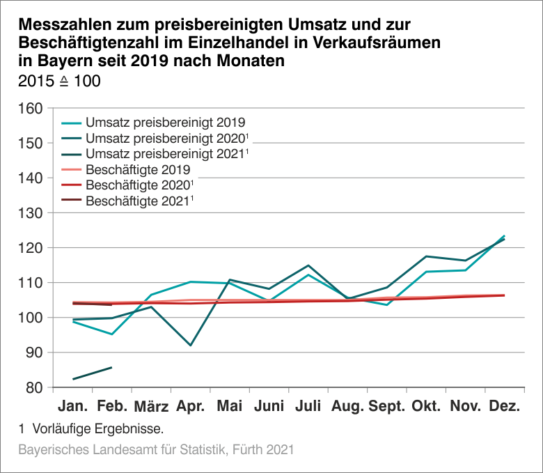 Von Januar bis Februar 2021 stieg der nominale Umsatz des bayerischen Einzelhandels gegenüber dem Vorjahreszeitraum um 0,8 Prozent (real: -0,2 Prozent). Die Zahl der Beschäftigten erhöhte sich um 0,9 Prozent.
