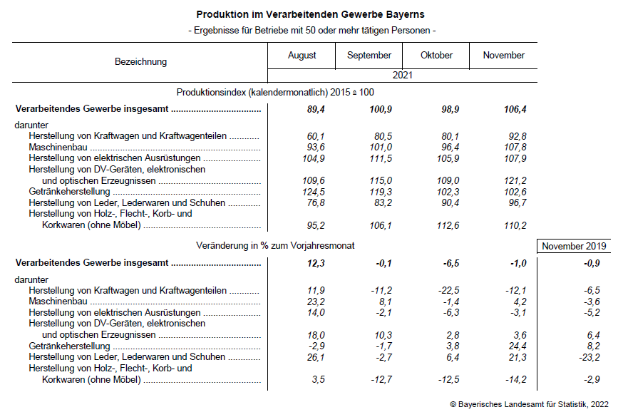Nach Angaben des Bayerischen Landesamts für Statistik verzeichnet die Produktion des Verarbeitenden Gewerbes in Bayern im November 2021 gegenüber Vorjahresmonat einen leichten Rückgang von 1,0 Prozent.