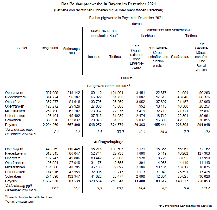 Auftragseingänge steigen in Bayerns Bauhauptgewerbe um gut ein Fünftel im Dezember 2021