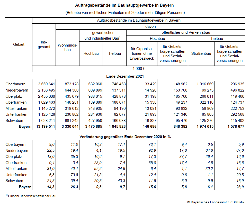 Nach Mitteilung des Bayerischen Landesamts für Statistik verbucht das Bauhauptgewerbe in Bayern Ende Dezember 2021 einen Auftragsbestand im Gesamtwert von 13,2 Milliarden Euro. Das sind 1,65 Milliarden Euro beziehungsweise 14,3 Prozent mehr als vor Jahresfrist. Hierbei sind für alle Bausparten und für alle Regierungsbezirke höhere Auftragsbestände festzustellen. Den größten Anteil am aktuell gesamten Auftragsbestand verzeichnet unter den Bausparten der gewerbliche und industrielle Hochbau mit 3,48 Milliarden Euro beziehungsweise 26,3 Prozent und unter den Regierungsbezirken Oberbayern mit 3,66 Milliarden Euro beziehungsweise 27,7 Prozent. Gegenüber Vorjahresquartal ist das ein Plus von 9,8 Prozent beziehungsweise 9,0 Prozent.