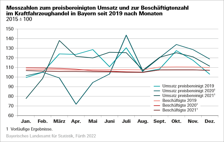 Im Dezember 2021 fällt der nominale Umsatz im bayerischen Kfz-Handel gegenüber dem Vorjahresmonat um 2,3 Prozent und der reale Umsatz um 6,8 Prozent. Die Zahl der Beschäftigten liegt ebenfalls leicht im Minus.