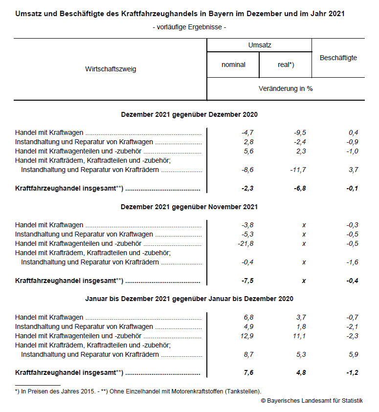 Wie das Bayerische Landesamt für Statistik nach den vorläufigen Ergebnissen der „Monatsstatistik im Kfz-Handel, Instandhaltung und Reparatur von Kfz eingeschlossen“, mitteilt, steigt hier der Umsatz im Jahr 2021 im Vergleich zum Vorjahr nominal um 7,6 Prozent. Preisbereinigt beträgt das Umsatzwachstum 4,8 Prozent. Die Zahl der Beschäftigten fällt hingegen um 1,2 Prozent.
