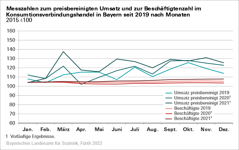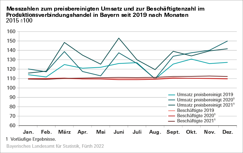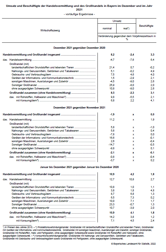 Im Dezember 2021 steigt der nominale Umsatz im bayerischen Großhandel gegenüber dem Vorjahresmonat um 8,2 Prozent, sinkt jedoch preisbereinigt um 2,4 Prozent. Die Beschäftigtenzahl erhöht sich um 3,3 Prozent.