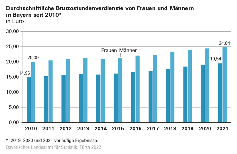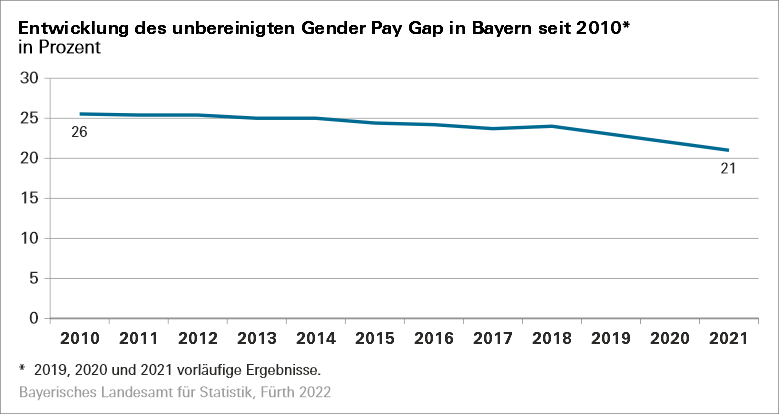 Im Jahr 2021 beträgt der durchschnittliche Bruttostundenverdienst von Frauen im Freistaat 19,54 Euro, der von bayerischen Männern 24,84 Euro. Das bedeutet für den Freistaat einen „unbereinigten Gender Pay Gap“ von 21 Prozent. „Unbereinigt“ heißt er an dieser Stelle, da strukturelle Unterschiede zwischen Frauen und Männern nicht berücksichtigt werden. Unterschiede struktureller Natur in der Berufswelt zwischen Frauen und Männern zeigen sich zum Beispiel bei der Berufswahl oder dem Anteil an Teilzeitbeschäftigungen.