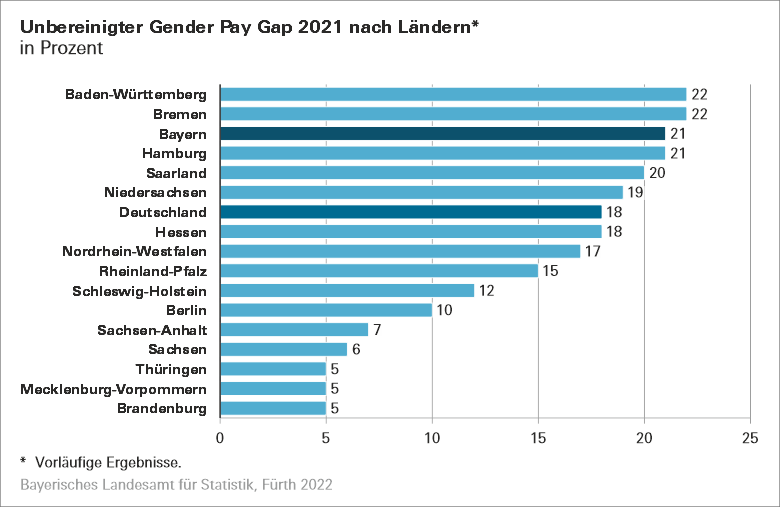 Der „unbereinigte Gender Pay Gap“ in Bayern ist im Jahr 2021 um drei Prozentpunkte größer als im Bundesdurchschnitt mit 18 Prozent. Unter den Bundesländern weist Bayern zusammen mit Hamburg den dritthöchsten unbereinigten Wert auf. In den neuen Bundesländern liegt die Lohnlücke auf deutlich niedrigerem Niveau als in den alten Ländern. Die Spanne reicht von fünf Prozent in Thüringen, Mecklenburg-Vorpommern und Brandenburg bis 22 Prozent in Baden-Württemberg und Bremen. Die vergleichsweise geringen Verdienstunterschiede zwischen den Geschlechtern in den neuen Bundesländern sind unter anderem auf eine höhere Erwerbsbeteiligung von Frauen und einen höheren Anteil an Akademikerinnen zurückzuführen.