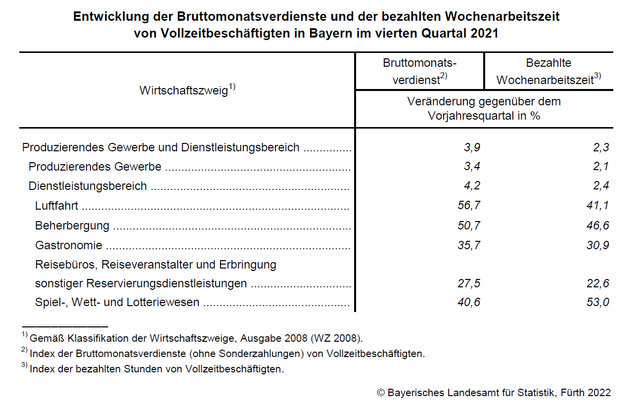 Alle Wirtschaftsabschnitte erzielen im vierten Quartal 2021 im Vergleich zum vierten Vorjahresquartal Verdienststeigerungen. Die Bruttomonatsverdienste – gemessen am Index der Bruttomonatsverdienste ohne Sonderzahlungen der Vollzeitbeschäftigten – steigen im Produzierenden Gewerbe und im Dienstleistungsbereich um 3,9 Prozent. Die Verdienstzuwächse fallen im Dienstleistungsbereich mit 4,2 Prozent stärker aus als im Produzierenden Gewerbe mit 3,4 Prozent. In den Wirtschaftszweigen „Beherbergung“ (+50,7 Prozent), „Gastronomie“ (+35,7 Prozent) sowie „Reisebüros, Reiseveranstalter und Erbringung sonstiger Reservierungsdienstleistungen“ (+27,5 Prozent) sowie „Spiel-, Wett- und Lotteriewesen“ (+40,6 Prozent) verzeichnet das Bayerische Landesamt für Statistik im Vergleich zum vierten Quartal 2020 deutlich steigende Verdienste..