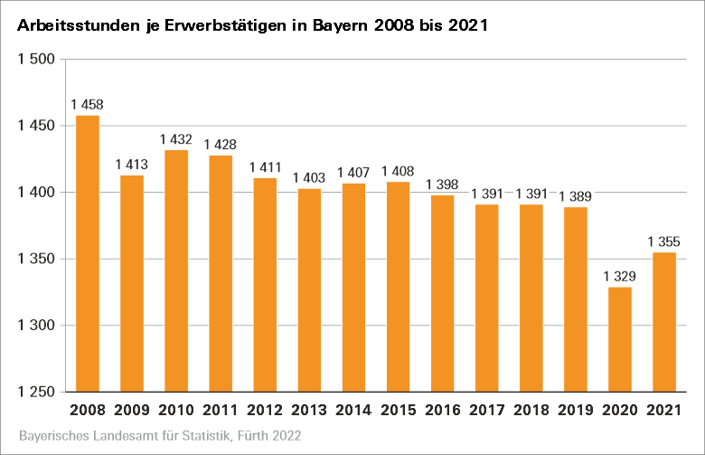 Jeder Erwerbstätige arbeitet 2021 in Bayern im Durchschnitt 1 355 Stunden und damit 1,9 Prozent mehr als ein Jahr zuvor. Das Niveau von 1 389 Stunden aus dem Jahr 2019 wird jedoch nicht erreicht. Dies dürfte mit der nach wie vor verbreiteten Kurzarbeit zusammenhängen. Daneben gibt es jedoch auch einen langfristigen Trend zu einer geringeren durchschnittlichen Stundenzahl, der vor allem der zunehmenden Bedeutung von Teilzeitarbeit geschuldet ist. So liegen beispielsweise die 1 389 Stunden aus dem Jahr 2019 mit seinerzeit weitgehender Vollbeschäftigung deutlich unter der durchschnittlichen Stundenzahl von 1 413 des Krisenjahres 2009, in dem die Kurzarbeit ähnlich wie in der Covid-19-Pandemie stark ausgedehnt wurde.