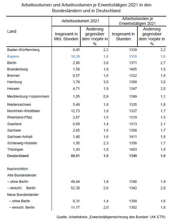Die hier vorgelegten Daten beruhen auf einer Berechnung des Arbeitsvolumens 2021 des Arbeitskreises „Erwerbstätigenrechnung der Länder“ (AK ETR), dem alle Statistischen Landesämter, das Statistische Bundesamt sowie der Deutsche Städtetag angehören. Weitere Ergebnisse zum Arbeitsvolumen können auf der Homepage des AK ETR unter www.statistikportal.de/de/etr/ergebnisse/arbeitsvolumen abgerufen werden.