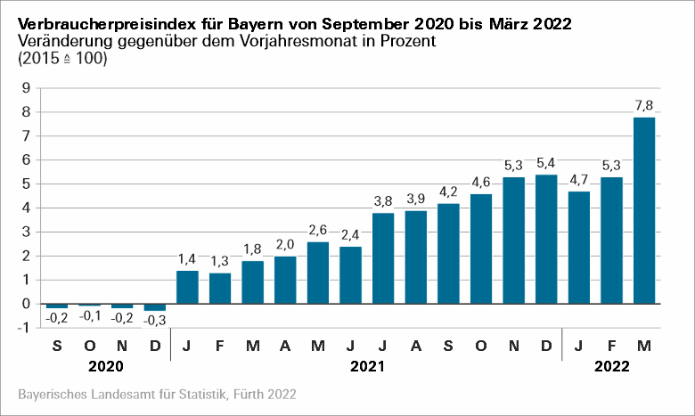 Die Inflationsrate, gemessen als prozentuale Veränderung des Verbraucherpreisindex für Bayern gegenüber dem entsprechenden Vorjahresmonat, liegt im März 2022 bei deutlichen 7,8 Prozent. Die sogenannte Kerninflationsrate, also der Gesamtindex ohne Nahrungsmittel und Energie, beträgt 3,6 Prozent.