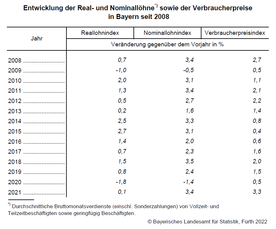 Bayerische Reallöhne steigen im Jahr 2021 um 0,1 Prozent