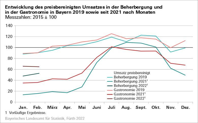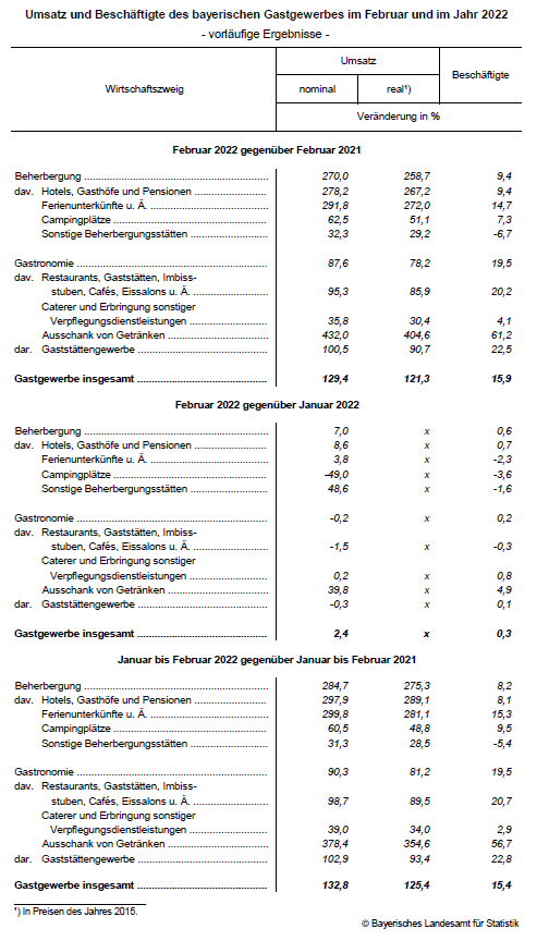 Wie das Bayerische Landesamt für Statistik nach vorläufigen Ergebnissen der „Monatsstatistik im Gastgewerbe“ berichtet, steigt der Umsatz des Gastgewerbes in Bayern im Februar 2022 gegenüber dem Vorjahresmonat nominal um 129,4 Prozent und preisbereinigt um 121,3 Prozent. Die Beschäftigtenzahl nimmt um 15,9 Prozent zu. Trotz des starken Anstiegs, sowohl beim Umsatz als auch bei den Beschäftigten, ist das Vor-Corona-Niveau des Gastgewerbes in Bayern auch im Februar 2022 nicht erreicht: Zum Februar 2019 beträgt die Umsatzlücke nominal 25,5 Prozent und real 32,5 Prozent. Die Beschäftigtenzahl liegt noch 19,2 Prozent unter der des Februars 2019.