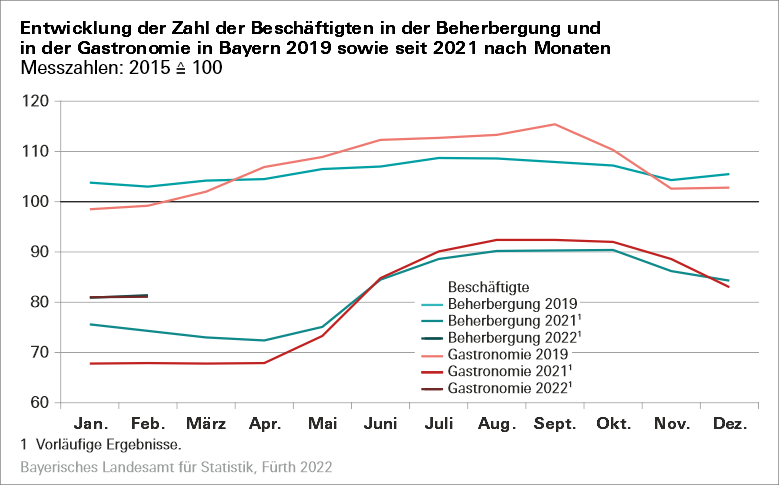 Fürth/Schweinfurt. Wie das Bayerische Landesamt für Statistik weiter berichtet, setzt sich der deutliche Zuwachs an Beschäftigten zum Vorjahresmonat Februar 2021 von fast 16 Prozent aus der starken Zunahme der Beschäftigtenzahl in der Gastronomie von 19,5 Prozent sowie der Beherbergung von 9,4 Prozent zusammen. Mit Ausnahme der „sonstigen Beherbergungsstätten“ steigt die Zahl der Beschäftigten im Februar 2022 zum Vorjahresmonat in allen Wirtschaftsgruppen des Gastgewerbes. Im Vergleich zu den Entwicklungen im Jahr 2019, vor der Corona-Pandemie, ist die Zahl der Beschäftigten im bayerischen Gastgewerbe im Februar 2022 jedoch noch um 19,2 Prozent geringer. In der Beherbergung sind im Vergleich zum Februar 2019 noch 21,0 Prozent weniger beschäftigt, in der Gastronomie sind es 18,2 Prozent weniger.