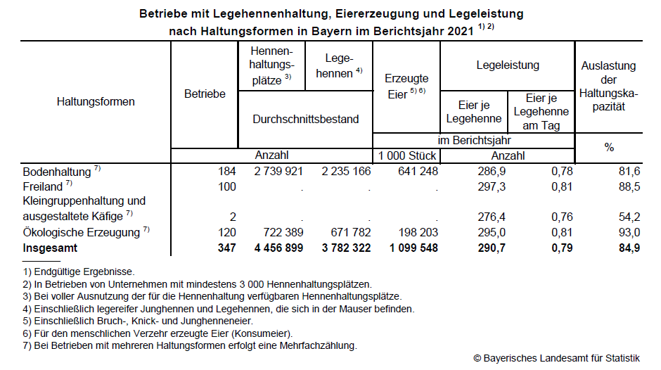 bayerischen Eier (198,2 Millionen). Die restlichen 260,1 Millionen Eier (23,7 Prozent) wurden zum Großteil in Betrieben mit Freilandhaltung sowie zu einem geringen Anteil in Betrieben mit Kleingruppenhaltung und ausgestalteten Käfigen produziert.