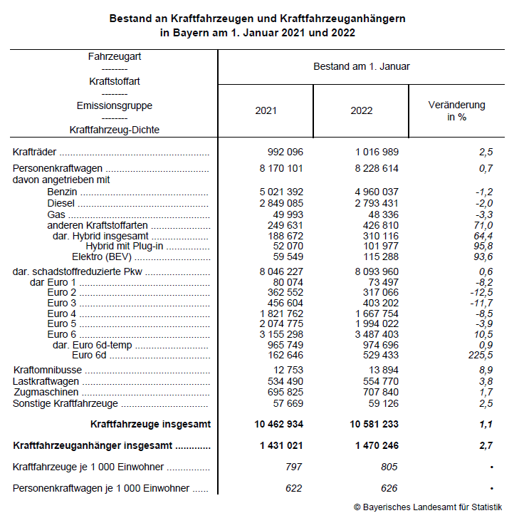 Fürth/Schweinfurt. Nach den Ergebnissen der Bestandstatistik des Kraftfahrt-Bundesamts sind am 1. Januar 2022 in Bayern rund 10,6 Millionen Kraftfahrzeuge (Kfz) mit amtlichen Kennzeichen zum Verkehr zugelassen und damit 1,1 Prozent mehr als vor einem Jahr.