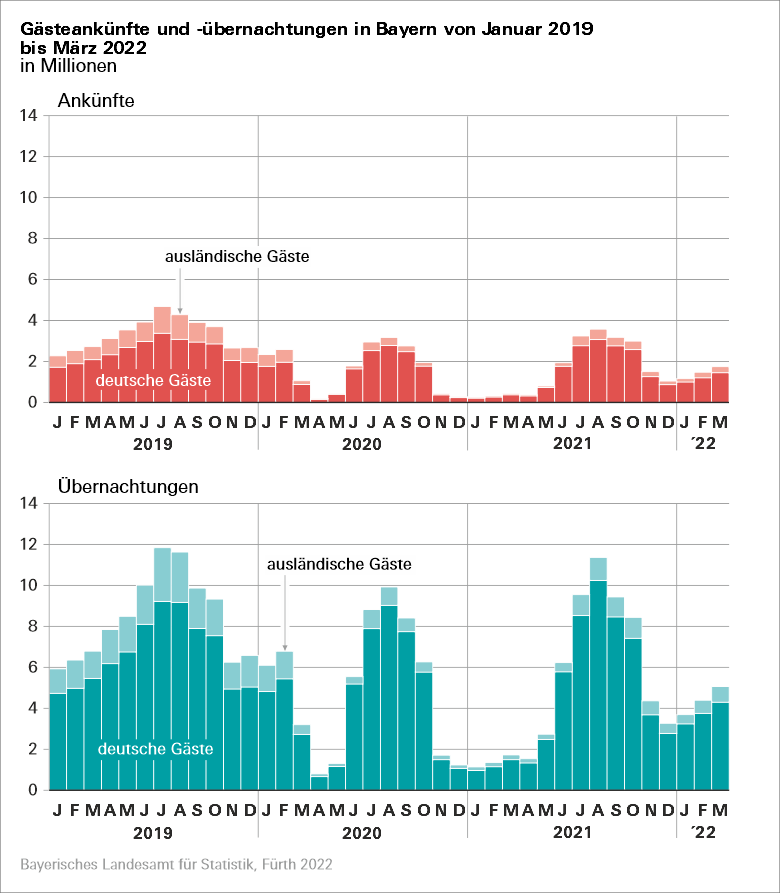Das Bayerische Landesamt für Statistik meldet auch im März 2022 weiter steigende Zahlen zur Monatserhebung im Tourismus. Für die rund 10 900 geöffneten Beherbergungsbetriebe1) Bayerns werden gut 1,7 Millionen Gästeankünfte und knapp 5,1 Millionen Übernachtungen veröffentlicht. Das erste Quartal 2022 endet somit mit knapp 4,4 Millionen Gästeankünften und rund 13,1 Millionen Übernachtungen. Sowohl im März als auch im ersten Quartal letzten Jahres lagen die Ergebnisse durch den zweiten Corona-Lockdown deutlich niedriger.