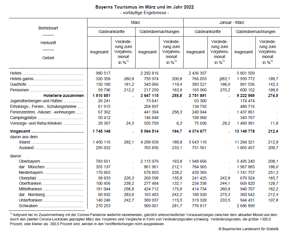 Fürth/ Schweinfurt. Auch im März 2022 meldet das Bayerische Landesamt für Statistik eine steigende Nachfrage bei den 10 860 geöffneten Beherbergungsbetrieben. Gut 1,7 Millionen Gäste kommen in den Freistaat und übernachten rund 5,1 Millionen Mal in einem bayerischen Beherbergungsbetrieb. Damit endet auch das erste Quartal 2022 deutlich positiver als im Vorjahr, in dem das erste Quartal noch vom zweiten Corona-Lockdown geprägt war. Insgesamt werden rund 4,4 Millionen Gästeankünfte (davon 83,3 Prozent aus dem Inland, 16,7 Prozent aus dem Ausland) und gut 13,1 Millionen Übernachtungen verzeichnet.2)