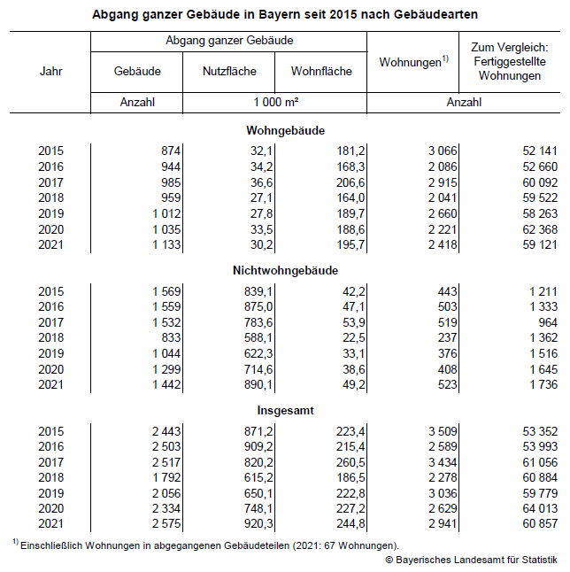 Im Verlauf des Jahres 2021 melden die bayerischen Bauämter zur amtlichen Bauabgangsstatistik den durch Abriss oder Umwidmung bedingten Verlust von 2 575 Gebäuden und 175 Gebäudeteilen aus dem Gebäudebestand im Freistaat. Nach Mitteilung des Bayerischen Landesamts für Statistik sind das 241 verlorene Gebäude und 87 Gebäudeteile mehr als noch im Jahr 2020. Gut zwei Fünftel der im Berichtsjahr aus dem Gebäudebestand im Freistaat abgegangenen Gebäude sind Wohngebäude und darunter 991 beziehungsweise 87,5 Prozent Eigenheime. Der Abgang der ganzen Gebäude geht mit einem Verlust an 244 823 m² Wohnfläche und 920 263 m² Nutzfläche einher. Mit den insgesamt 2 750 Gebäuden und Gebäudeteilen werden zusammen 2 941 Wohnungen aus dem bayerischen Wohnungsbestand beseitigt.
