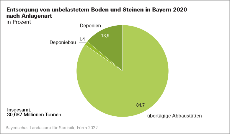 26,0 Millionen Tonnen Boden und Steine (etwa 84,7 Prozent) wurden in Bayern zur Verfüllung von Tagebaugruben (übertägige Abbaustätten von Kalkstein, Ton und anderen mineralischen Rohstoffen) eingesetzt. Weitere rund 0,4 Millionen Tonnen (1,4 Prozent) nutzte man als Ersatzbaustoff für Deponiebaumaßnahmen. Die Verwertungsquote liegt damit insgesamt bei 86,1 Prozent und damit über dem Bundesdurchschnitt von 84,2 Prozent. Knapp 4,3 Millionen Tonnen Boden und Steine (13,9 Prozent) konnten jedoch keiner Verwertung zugeführt werden. Sie wurden auf Deponien beseitigt.