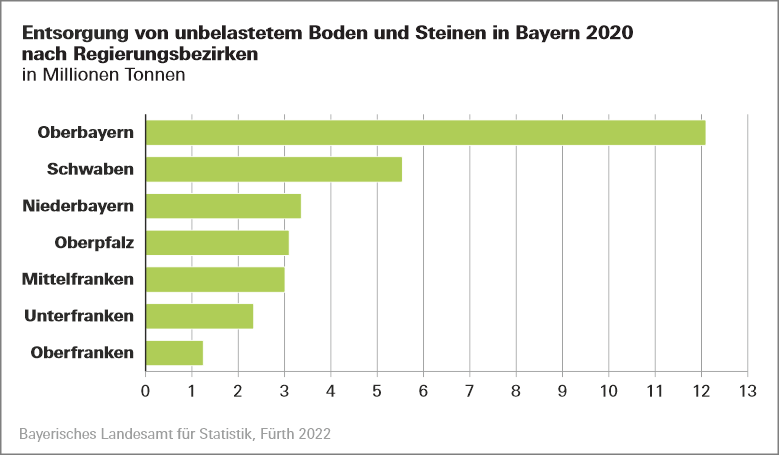 Innerhalb Bayerns gibt es große Unterschiede hinsichtlich der Entsorgungsmengen. Auf Ebene der Regierungsbezirke wurde mit 12,1 Millionen Tonnen die größte Menge Boden und Steine in Oberbayern entsorgt. Im Landkreis Starnberg beläuft sich die entsorgte Menge auf 1,6 Millionen Tonnen – Spitzenreiter unter den Landkreisen. Weitere Landkreise in denen über eine Million Tonnen entsorgt wurden, waren der Landkreis Neumarkt i.d.OPf. (1,3 Millionen Tonnen) und der Landkreis Traunstein (1,2 Millionen Tonnen). Dagegen sind die Mengen in den kreisfreien Städten aufgrund fehlender Entsorgungsmöglichkeiten eher gering.