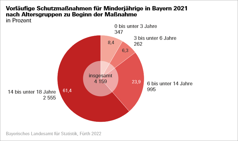 Wie das Bayerische Landesamt für Statistik mitteilt, stieg die Zahl der schutzbedürftigen Minderjährigen auf 4 159 Fälle, was einem Plus von 24 Prozent gegenüber dem Vorjahr (3 342) entspricht. Die Zahl der unbegleitet aus dem Ausland eingereisten Minderjährigen stieg von 619 Kindern- und Jugendlichen im Jahr 2020 auf 1 407 im Jahr 2021. Das entspricht einem Plus von 127 Prozent.
