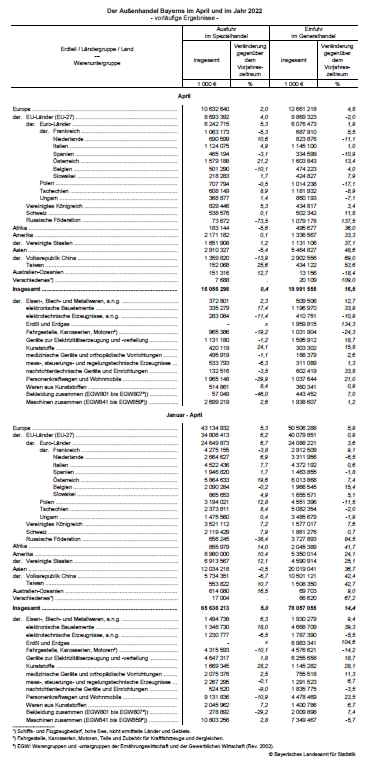 Wie das Bayerische Landesamt für Statistik nach den vorläufigen Ergebnissen der Außenhandelsstatistik mitteilt, wachsen die Exporte der bayerischen Wirtschaft im April 2022 gegenüber dem April 2021 um 0,4 Prozent auf 16,1 Milliarden Euro. Die Importe steigen unterdessen um 16,5 Prozent auf 20,0 Milliarden Euro. Von Januar bis April 2022 erhöhen sich die Exporte der bayerischen Wirtschaft gegenüber dem Vorjahreszeitraum um 5,0 Prozent auf 65,6 Milliarden Euro. Die Importe nehmen um 14,4 Prozent auf 78,1 Milliarden Euro zu.