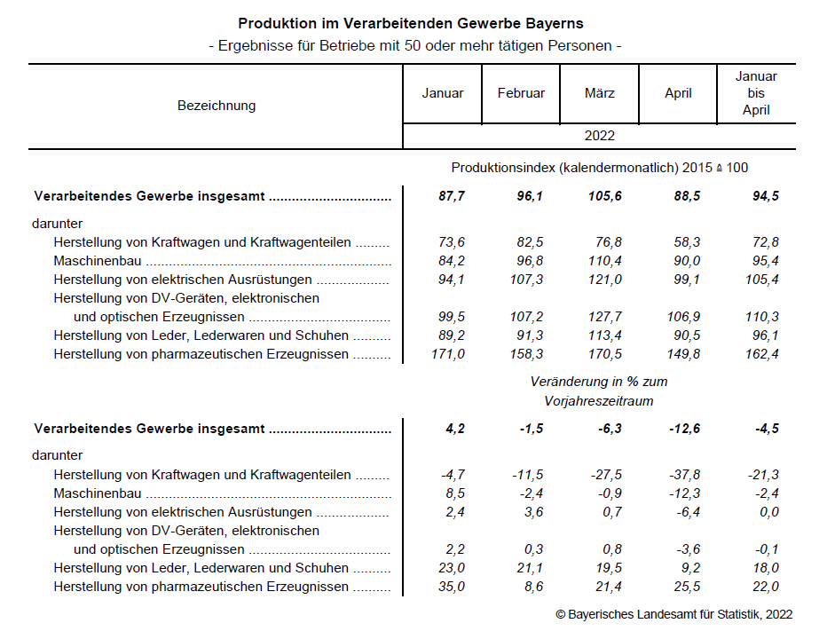 Nach Angaben des Fachteams im Bayerischen Landesamt für Statistik verzeichnet die Produktion des Verarbeitenden Gewerbes in Bayern im April gegenüber dem Vorjahresergebnis einen Rückgang von 12,6 Prozent. Die ersten vier Monate des Jahres 2022 ergeben ein Minus von 4,5 Prozent.
