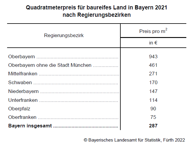 Bayern im Jahr 2021 im Durchschnitt auf 287 Euro. Dabei bestehen zwischen den einzelnen Regierungsbezirken große Preisunterschiede. Mit einem Preis von 943 Euro je Quadratmeter ist baureifes Land im Regierungsbezirk Oberbayern am teuersten. Der niedrigste Preis liegt hingegen in Oberfranken vor; im Durchschnitt werden dort für einen Quadratmeter baureifes Land nur 75 Euro bezahlt.