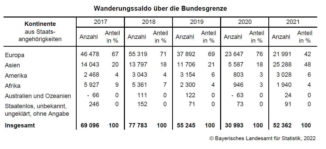 Wie das Bayerische Landesamt für Statistik weiter mitteilt, entfielen 42 Prozent des Wanderungsüberschusses gegenüber dem Ausland auf Personen mit einer europäischen Staatsangehörigkeit (21 991), darunter sieben Prozent mit einer EU-Staatsangehörigkeit (1 583). 48 Prozent des positiven Wanderungssaldos mit dem Ausland ist auf Personen mit einer asiatischen Staatsangehörigkeit (25 288) zurückzuführen. Damit hat sich der Anteil dieser Gruppe am Gesamtwanderungssaldo mehr als verdoppelt (in den Jahren 2017 bis 2020 lag er zwischen 18 und 21 Prozent).