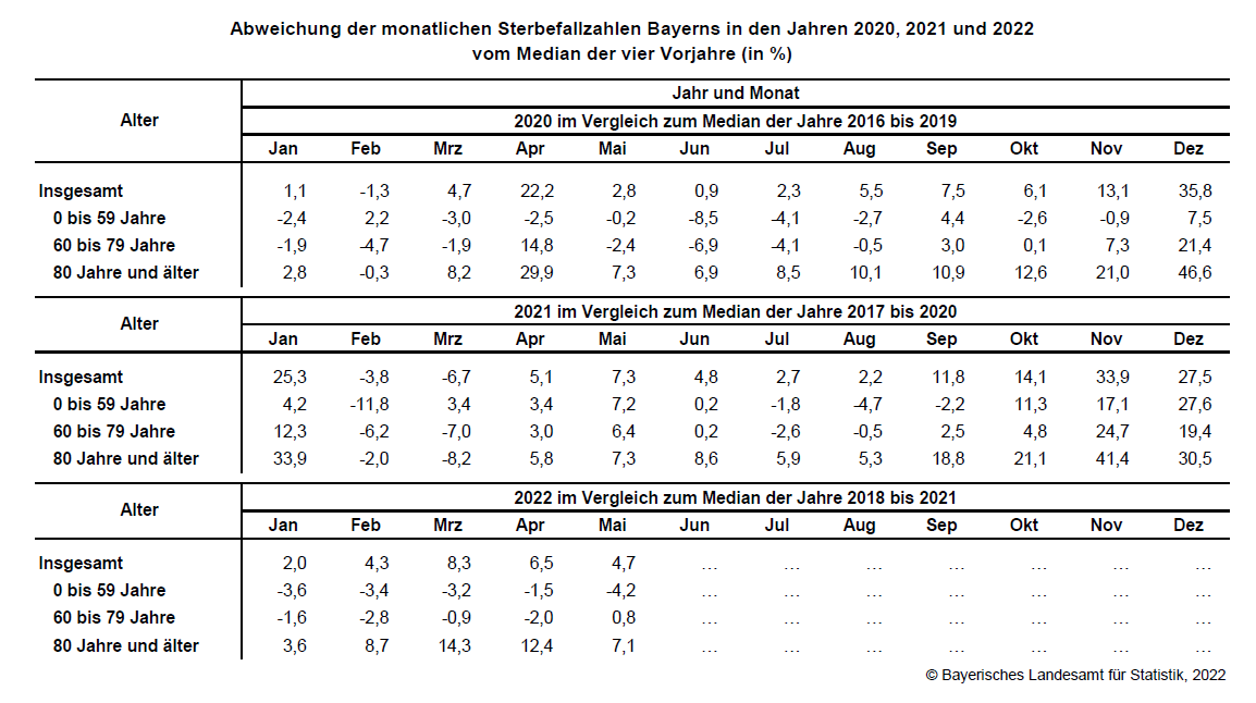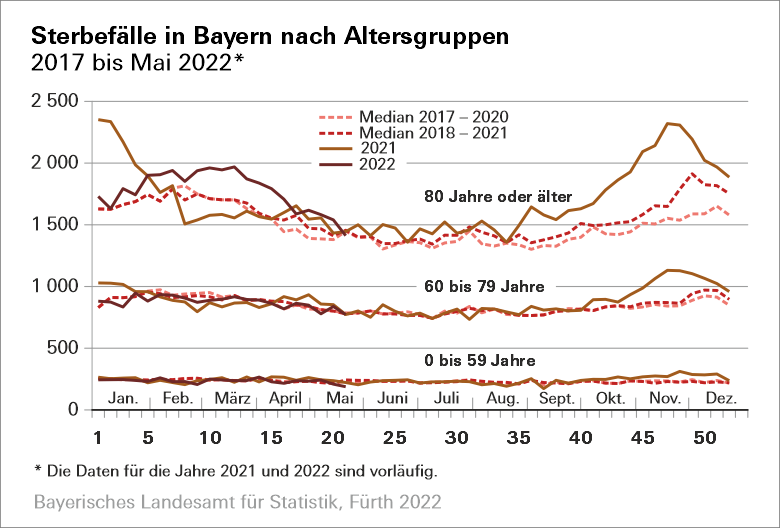 Fürth. Wie das Fachteam des Bayerischen Landesamts für Statistik nach Auswertung vorläufiger Daten mitteilt, liegt die Zahl an Verstorbenen im Freistaat mit 11 364 Personen im Mai 2022 insgesamt auf ähnlichem Niveau wie in den Jahren vor der Covid19-Pandemie. Bei Personen unter 60 Jahren verzeichnet das Bayerische Landesamt für Statistik im Betrachtungsmonat einen leichten Rückgang der Sterbefälle um 4,2 Prozent. Bei den 80-Jährigen und Älteren liegen die Sterbefallzahlen 7,1 Prozent über dem Median der Jahre 2018 bis 2021.