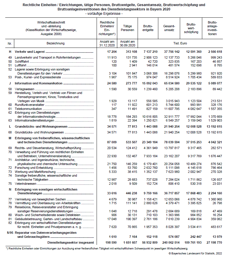 Ausführliche Ergebnisse enthält der in Kürze erscheinende Statistische Bericht „Struktur des bayerischen Dienstleistungssektors 2020“ (Bestellnummer: J1100C 202000). Der Bericht kann im Internet unter www.statistik.bayern.de/statistik/wirtschaft_handel/dienstleistungen/ als Datei kostenlos heruntergeladen werden. Weitere Informationen zum Bezug von Druckausgaben erhalten Sie beim Vertrieb per E-Mail (vertrieb@statistik.bayern.de), Telefon (0911 98208-6311) oder Fax (0911 98208-6638).