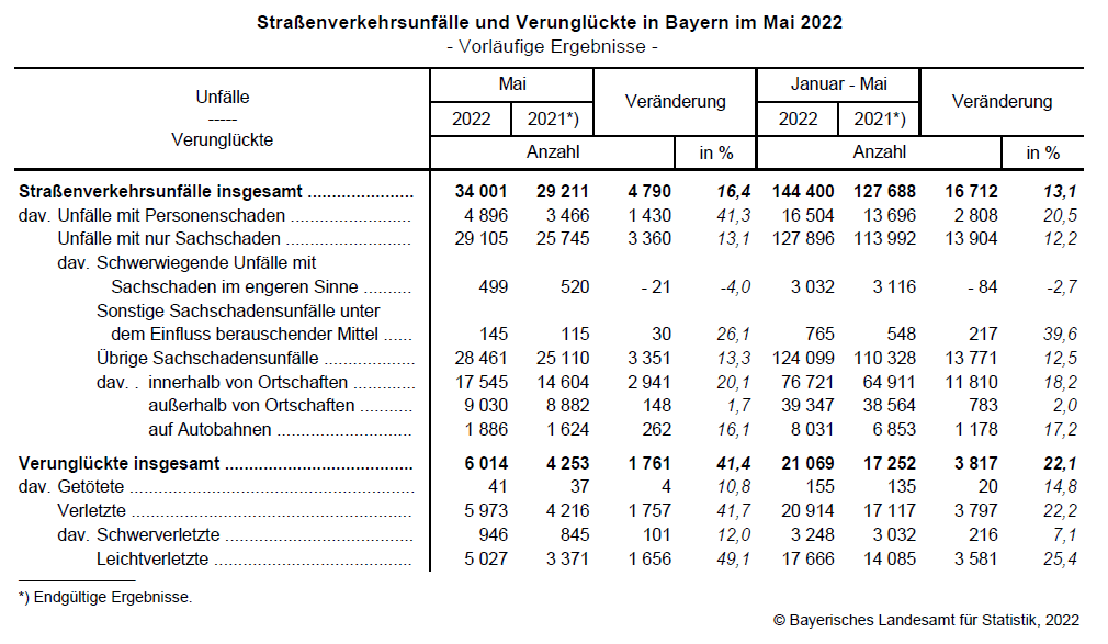 Im Mai 2022 steigen die Unfallzahlen auf Bayerns Straßen gegenüber dem Vorjahresmonat um 16,4 Prozent auf insgesamt 34 001 Unfälle. Wie das Bayerische Landesamt für Statistik nach den vorläufigen Meldungen der Polizei weiter mitteilt, werden mit einem Plus von 41,3 Prozent vor allem deutlich mehr Unfälle mit Personenschaden registriert. 6 014 Verkehrsteilnehmer sterben oder verletzen sich bei diesen Unfällen (+41,4 Prozent ggü. Mai 2021).