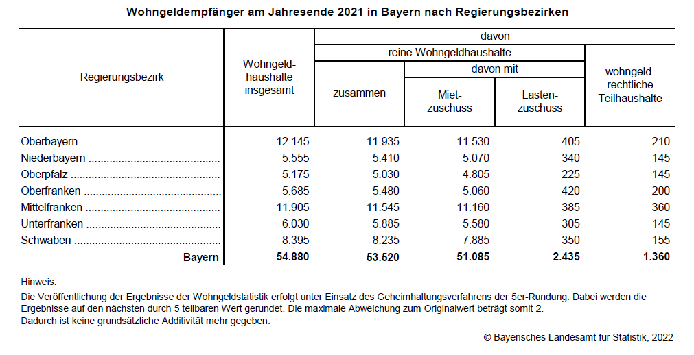Fürth/Schweinfurt. Nach Angaben des Bayerischen Landesamtes für Statistik gibt es zum Jahresende 2021 in Bayern insgesamt 53 520 reine Wohngeldhaushalte. Das