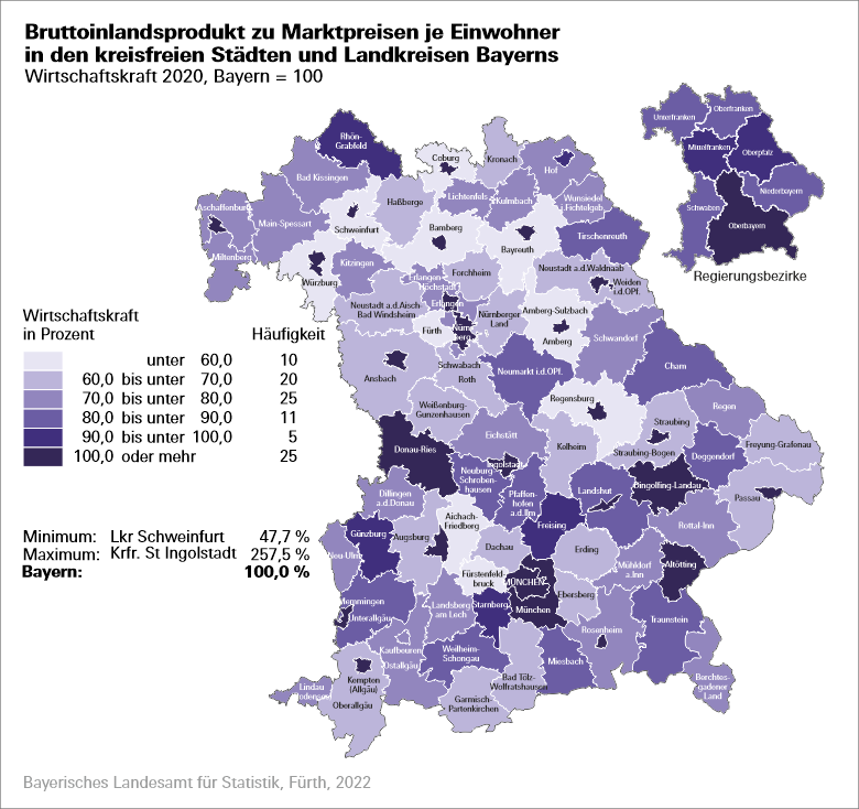 Das Bruttoinlandsprodukt je Einwohner, das als Maßstab der Wirtschaftskraft eines Landes oder einer Region gilt, beträgt 2020 in Bayern 47 546 Euro. Von den Regierungsbezirken erreichen Oberbayern mit 58 756 Euro und Mittelfranken mit 45 286 Euro die höchsten Werte. Auf Kreisebene führt Ingolstadt mit 122 410 Euro deutlich vor dem Landkreis München mit 112 192 Euro sowie der kreisfreien Stadt Erlangen mit 102 859 Euro. Hinsichtlich der Wirtschaftskraft dominieren in Bayern die kreisfreien Städte. Auf den ersten 20 Rängen befinden sich nur die Landkreise München und Dingolfing-Landau. In den kreisfreien Städten liegt das BIP je Einwohner mit durchschnittlich 71 133 Euro auch deutlich höher als in den Landkreisen mit 37 648 Euro.